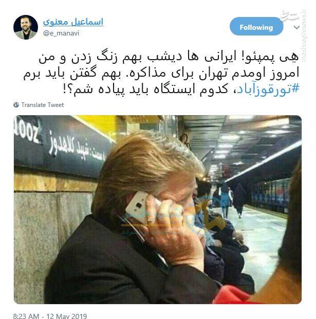 ولما كانت الصورة تظهر الرجل وهو يتحدث في هاتفه ، كتب شخص تغريدة ساخرة على لسان ترامب وهو يخاطب وزير خارجيته مايك بومبيو:" اسمع بومبي ، البارحة اتصل بي الايرانيون ، وانا اليوم في طهران من اجل المفاوضات ، قالوا لي عليّ ان اذهب الى تورقوزآباد ، اي محطة يجب ان أنزل".