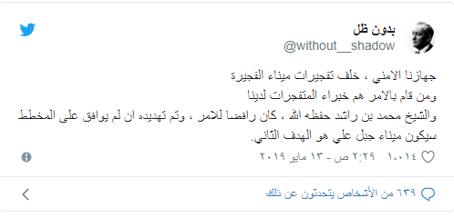واضاف “بدون ظل” في تغريدة له إن خبراء المتفجرات “لدينا” في إشارة إلى الامارات، هم من وقفوا وراء التفجيرات التي ضربت 4 ناقلات نفط، مشيراً إلى اعتراض حاكم دبي محمد بن راشد على الامر.