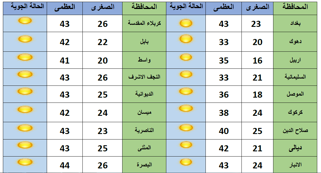وذكر بيان للأنواء الجوية ان "طقس يوم غد الأربعاء، سيكون صحواً في المناطق الوسطى والشمالية والجنوبية فيما يكون طقس الخميس، صحواً مع بعض الغيوم" مشيرة الى ان "درجات الحرارة العظمى ستكون في بغداد 43 مْ وفي البصرة 44 مْ".