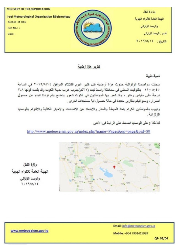 أفاد مصدر في الرصد الزلزالي بهيئة الأنواء الجوية، اليوم، بأن هزة أرضية ضربت مدينة الكوت،بقوة 3.8 على مقياس ريختر.
