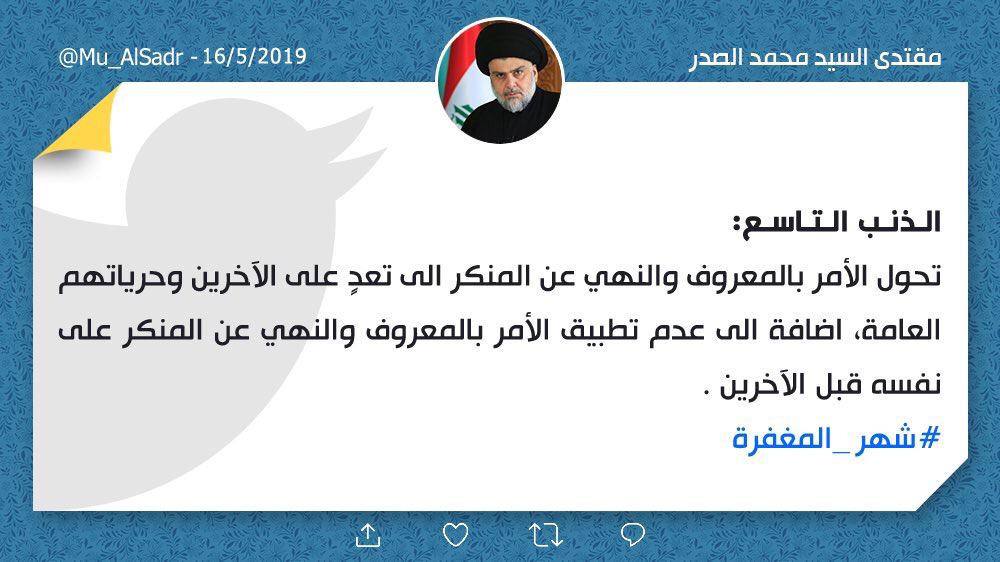 قال زعيم التيار الصدري مقتدى الصدر، في تغريدة على تويتر،امس الخميس، (16 ايار 2019)، ان الذنب التاسع هو: تحول الامر بالمعروف والنهي عن المنكر الى تعد على الاخرين وحرياتهم العامة، اضافة إلى عدم تطبيق الامر بالمعروف والنهي عن المنكر على نفسه قبل الاخرين.