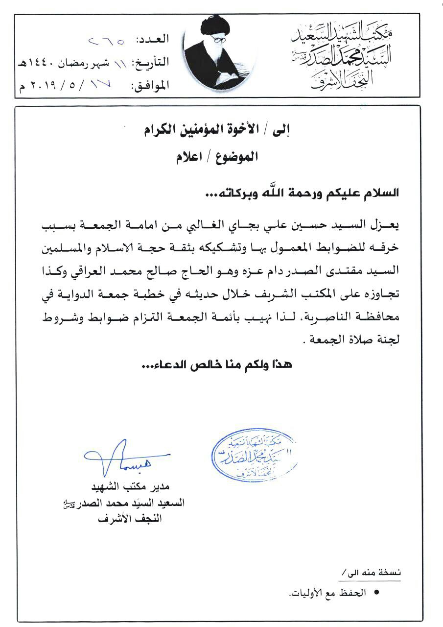واظهرت وثيقة صادرة عن المكتب، وتحمل توقيع مديره، امس، (17 آيار 2019)، ان "حسين علي بجاي الغالبي، خرق الضوابط المعمول بها وشكك بثقة حجة الاسلام والمسلمين مقتدى الصدر وهو الحاج صالح محمد العراقي، وكذا تجاوزه على المكتب خلال حديثه في خطبة جمعة الدواية في محافظة الناصرية".