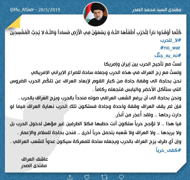 وقال الصدر في تغريدة له نشرت على حسابه الرسمي في "تويتر"، "لست مع تأجيج الحرب بين ايران واميركا، ولست مع زج العراق في هذه الحرب وجعله ساحة للصراع الايراني الاميركي".
