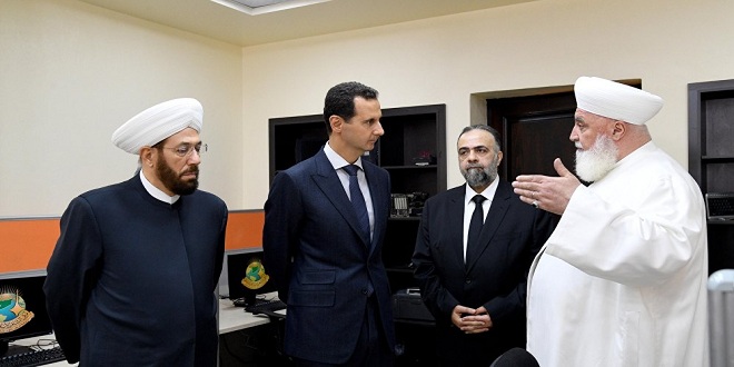 وجال الرئيس الأسد في أنحاء المركز واستمع إلى عرض من الشيخ الأفيوني حول الأقسام التي يتضمنها وهي المعهد الوطني لتأهيل الأئمة والخطباء في كل المحافظات والمعهد الدولي للعلوم الشرعية والعربية للراغبين في الحصول على العلوم الشرعية من علماء بلاد الشام الوسطية وقسم رصد الأفكار المتطرفة والفتاوى التكفيرية عبر شبكة الانترنت وكيفية تحليلها ومعالجتها.