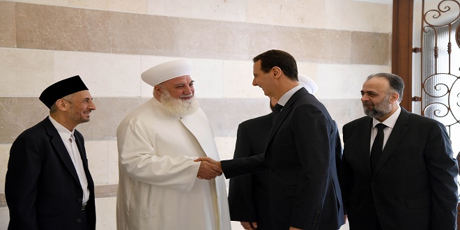 واضاف الرئيس السوري خلال افتتاح مركز الشام الإسلامي الدولي لمواجهة الإرهاب والتطرف التابع لوزارة الأوقاف السورية، حيث كان في استقباله وزير الأوقاف ومدير المركز الشيخ عدنان الأفيوني مفتي دمشق وريفها والمفتي العام للجمهورية ورئيس اتحاد علماء بلاد الشام وكبار علماء دمشق، قال: ان "الشعب السوري بمجمله يكافح التطرف من خلال صموده.. والجيش يكافح الإرهاب الناتج عن التطرف.. وعلماء الدين يكافحون هذا التطرف كمنتِج للإرهاب".