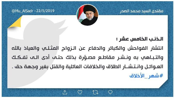 وقال الصدر: "ان الذنب الخامس عشر هو: انتشار الفواحش والكبائر والدفاع عن الزواج المثلي والعياذ بالله والتباهي به ونشر مقاطع مصورة بذلك، حتى أدى إلى تفكك العوائل وانتشار الطلاق والخلافات العائلية والقتل بغير وجهة حق".