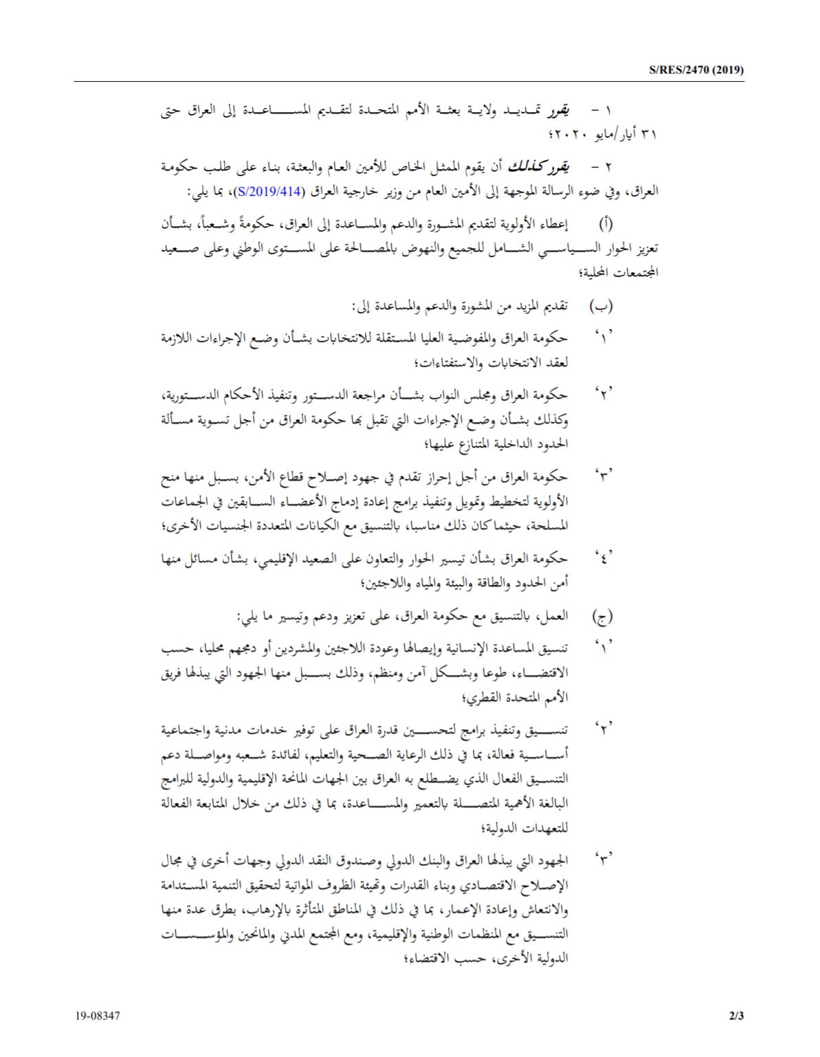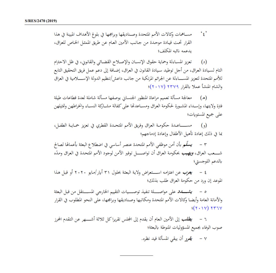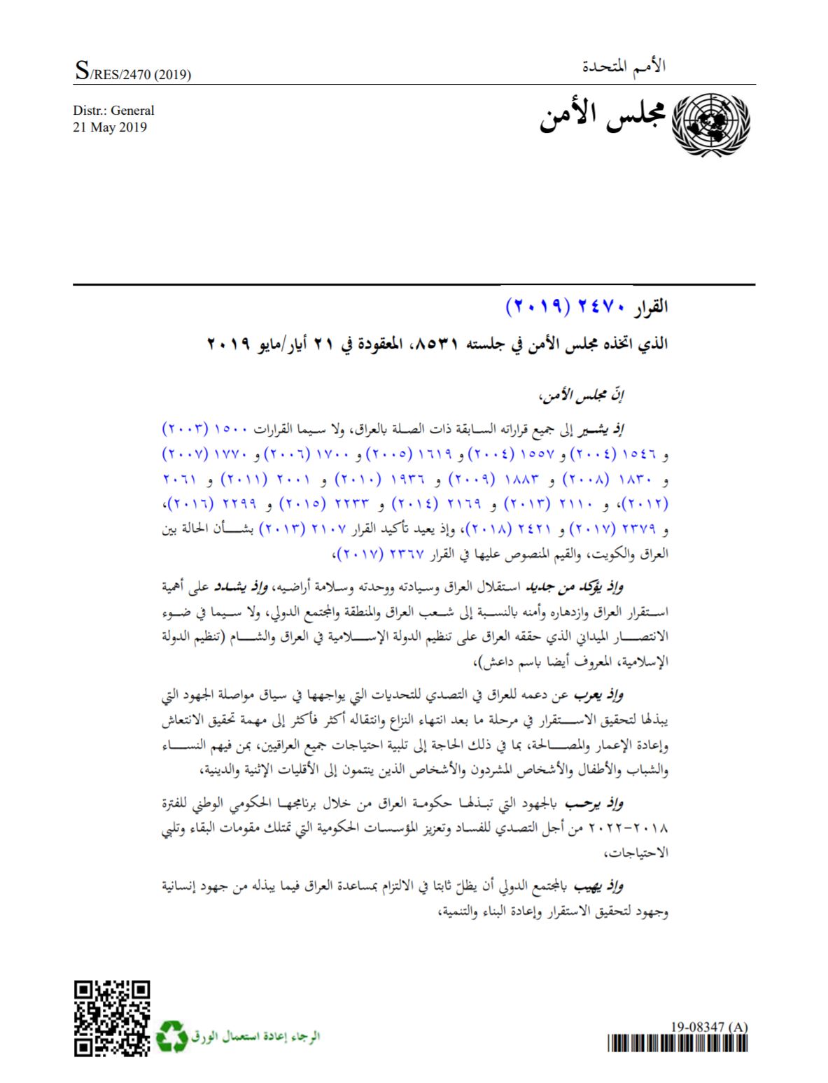 قرر مجلس الامن الدولي في جلسته الاخيرة التي عقدت يوم 21 آيار الماضي القرار رقم 2470 الخاص بالعراق، والذي يتضمن الكثير من التوصيات كما موضح بنص القرار أدناه.