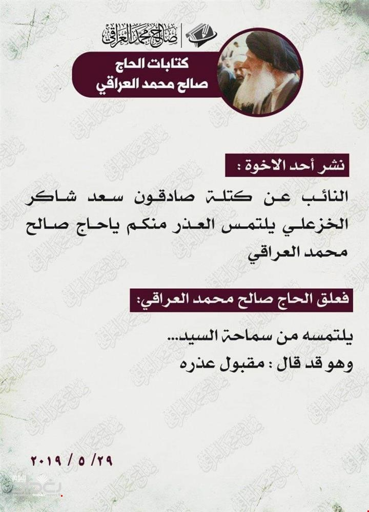 كان عضو مجلس النواب عن كتلة صادقون، سعد الخزعلي، قدم أمس الثلاثاء (28 أيار 2019)، اعتذاراً رسيماً إلى زعيم التيار الصدري مقتدى الصدر.