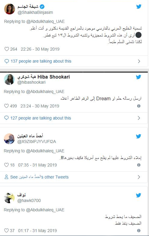 وقال ناشطون إن لغة "الغطرسة" التي يتحدث بها عبد الخالق عبد الله، توحي بأن المحور السعودي والإماراتي في حالة سطوة على طهران، وهو أمر غير واقع.
