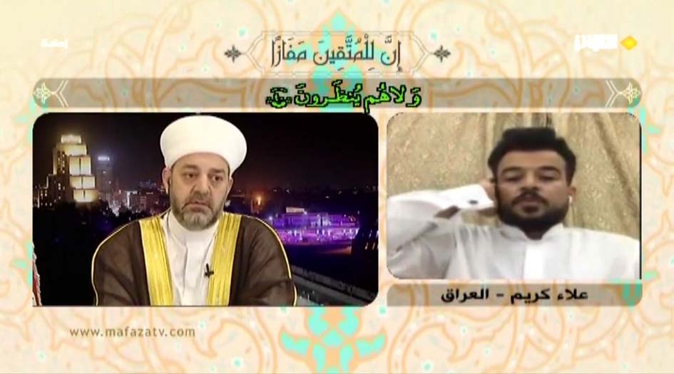 إن للمتقين مفازا – الكوثر: تلا القارئ المشارك من العراق "علاء كريم" الذي تم اختياره من قبل المشاهدين للمرحلة نصف النهائية تلاوته حسب القرعة من سورة الأنبياء في الليلة الأخيرة من المرحلة نصف النهائية من مسابقة "إن للمتقين مفازا" لشهر رمضان 2019.