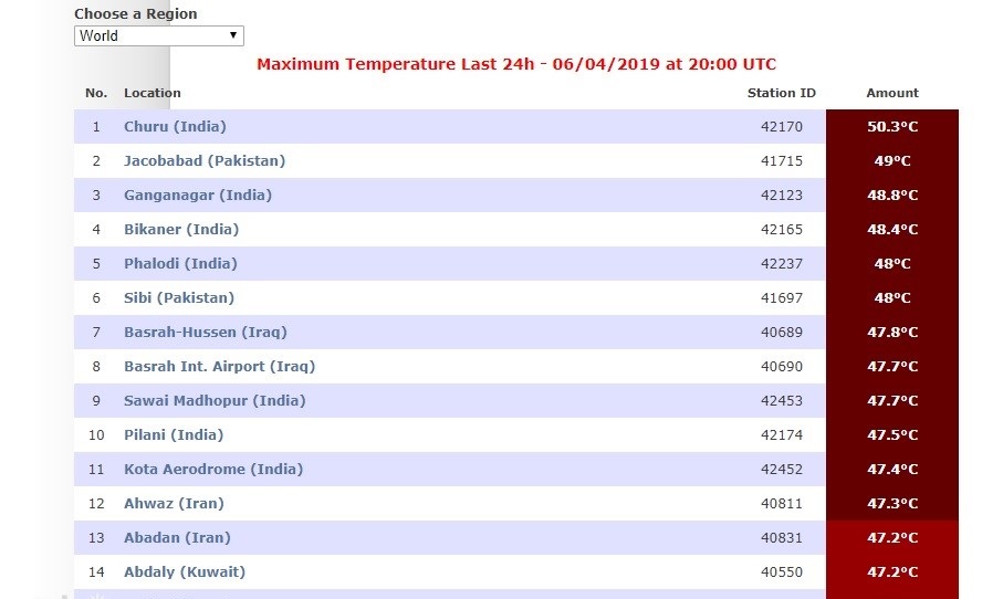 واوضح الموقع في منشور توضيحي، نشر مساء امس الثلاثاء، 4 حزيران 2019، ان "مدينة غورو الهندية سجلت اعلى درجة حرارة عظمى في العالم خلال الساعات الاربع والعشرين الماضية وبواقع 50,3 درجة مئوية تلتها مدينة جاكوب آباد في باكستان مسجلة 49 درجة مئوية".