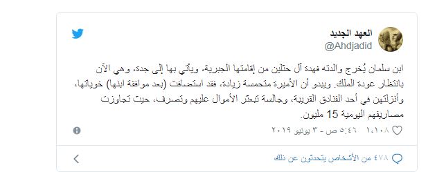 ولفت الحساب إلى أن الأميرة متحمسة زيادة ـ حسب وصفه ـ وذكر أنها استضافت (بعد موافقة ابنها) أخواتها، وأنزلتهن في أحد الفنادق القريبة، وتنفق عليهن ببذخ حيث تجاوزت مصاريفهم اليومية 15 مليون ريال.