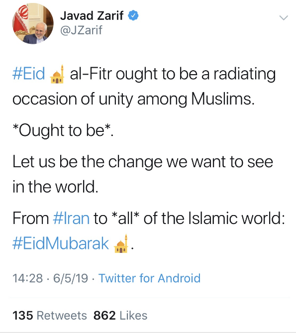 وفي تغريدة له في صفحته على تويتر، قدم محمد جواد ظريف التهنئة بمناسبة حلول عيد الفطر المبارك، وقال: ان عيد الفطر ينبغي ان يكون فترة مشرقة للتضامن بين المسلمين.