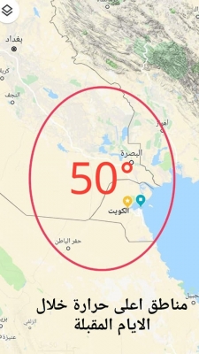 وتوقع "استمرار هذه الحرارة خلال أيام الاسبوع المقبل، بعد ان سجلت مدينة البصرة اليوم الاربعاء ثاني أعلى درجة حرارة عالمياً وبلغت 49 مْ في مركز الـمدينة"