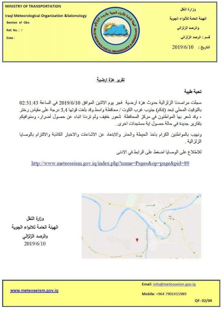 وبحسب الوثيقة، فإن المراصد الزلزالية سجلت هزة فجر اليوم وقعت جنوب غرب مدينة الكوت بمسافة 4 كم، حيث شعر بها المواطنين دون تسجيل خسائر.