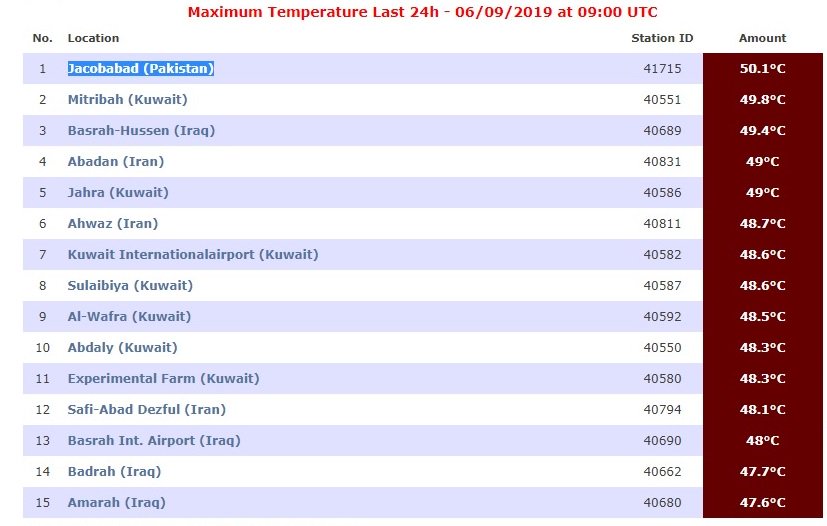 ونشرت محطة "بلاسيرفيلي" في كاليفورنيا الأمريكية، جدولاً يضم 15 منطقة ودولة بأعلى درجات الحرارة في العالم خلال الـ24 ساعة الماضية حيث بين الجدول ان منطقة جاكوب آباد سجلت اعلى درجات الحرارة بالعالم والتي بلغت درجة الحرارة فيها 50.1 درجة مئوية، تليها منطقة مطربة في الكويت بدرجة حرارة تبلغ 49.8 درجة مئوية ، تليها منطقة الحسين في البصرة بدرجة حرارة بلغت 49.4 درجة مئوية.