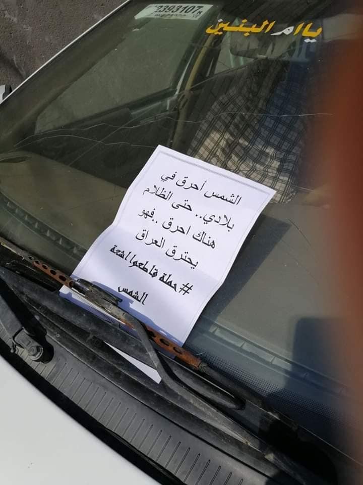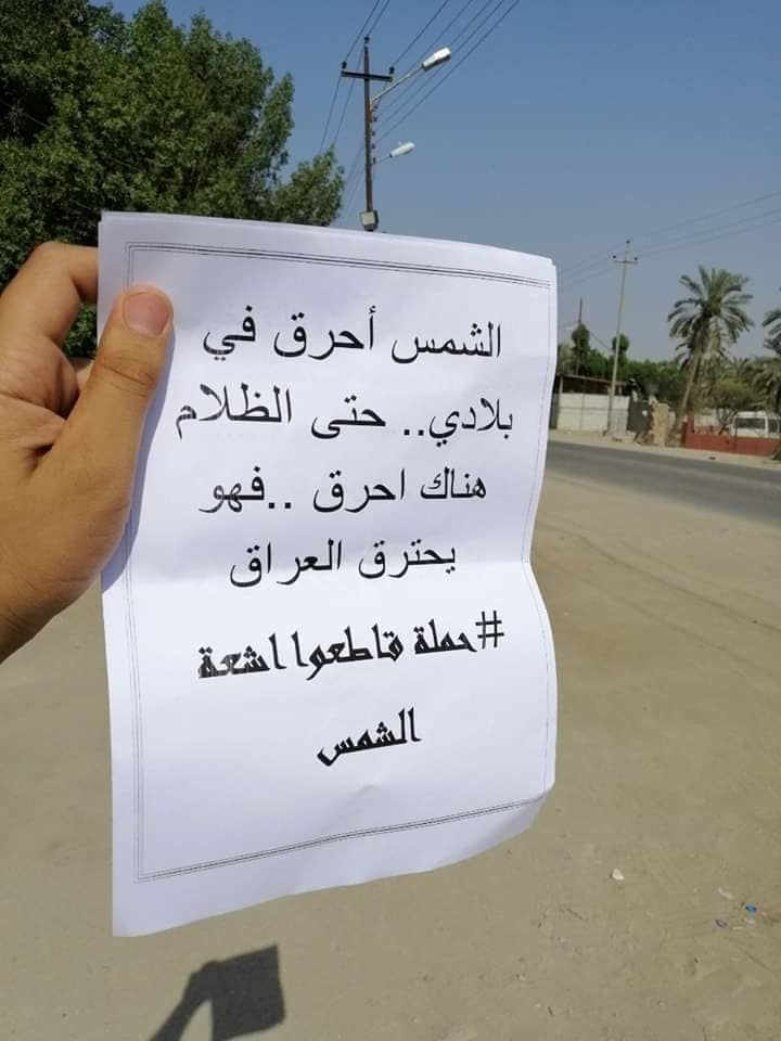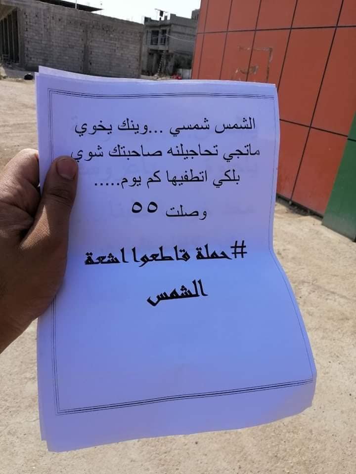وكتبت على تلك الاوراق عبارات "الشمس احرق في بلادي .. حتى الظلام هنلك احرق .."، "الشمس شمسي .. ودرجة الحرارة وصلت الى 55 .. "، فضلا عن اطلاق هاشتاك ( حملة قاطعوا اشعة الشمس) الذي تذيل تلك اليافطات.
