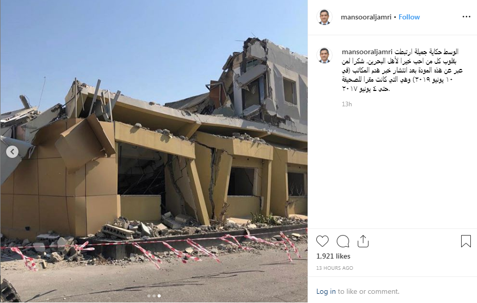 رئيس تحرير "الوسط" منصور الجمري كتب على حسابه على "انستغرام" معلّقًا على خبر الهدم: "الوسط حكاية جميلة ارتبطت بقلوب كل من احب خيرا لأهل البحرين. شكرًا لمن عبّر عن هذه المودة بعد انتشار خبر هدم المكاتب (في 10 يونيو 2019) وهي التي كانت مقرا للصحيفة حتى 4 يونيو 2017.".