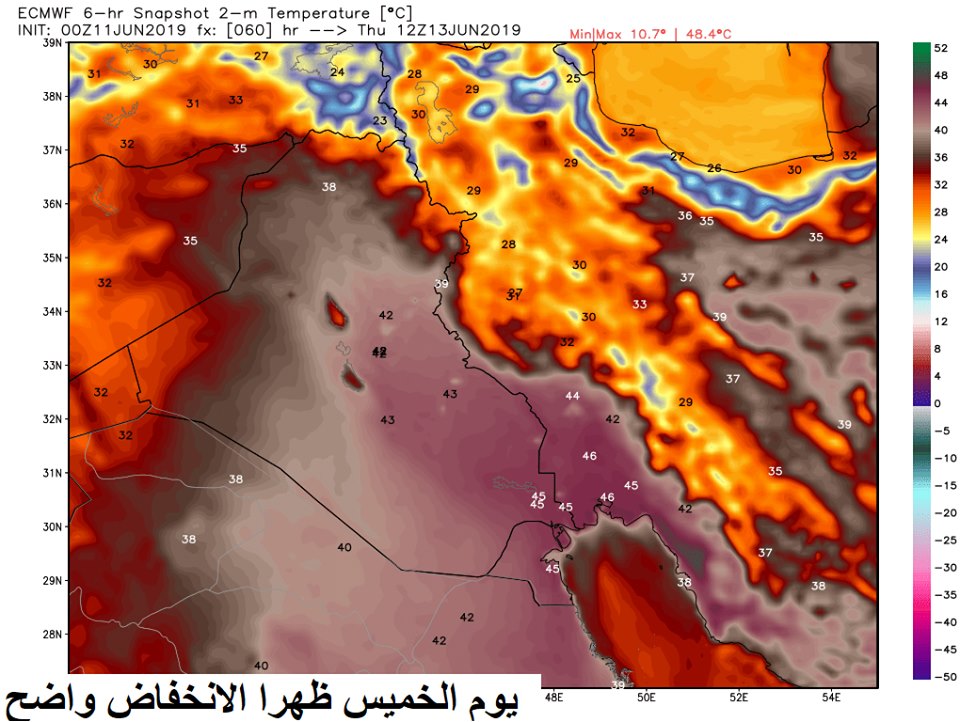 وأضاف "أما يوم الخميس فالانخفاض واضح كما في الخارطة" مستدركا بالقول "لكن لموجات الحرارة عودة أخرى يوم الاحد المقبل