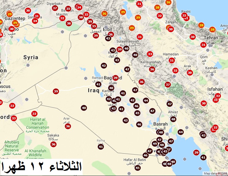 ونشر صادق عطية في صفحته في الفيسبوك خريطة بدرجات الحرارة المسجلة منتصف نهار اليوم الثلاثاء.