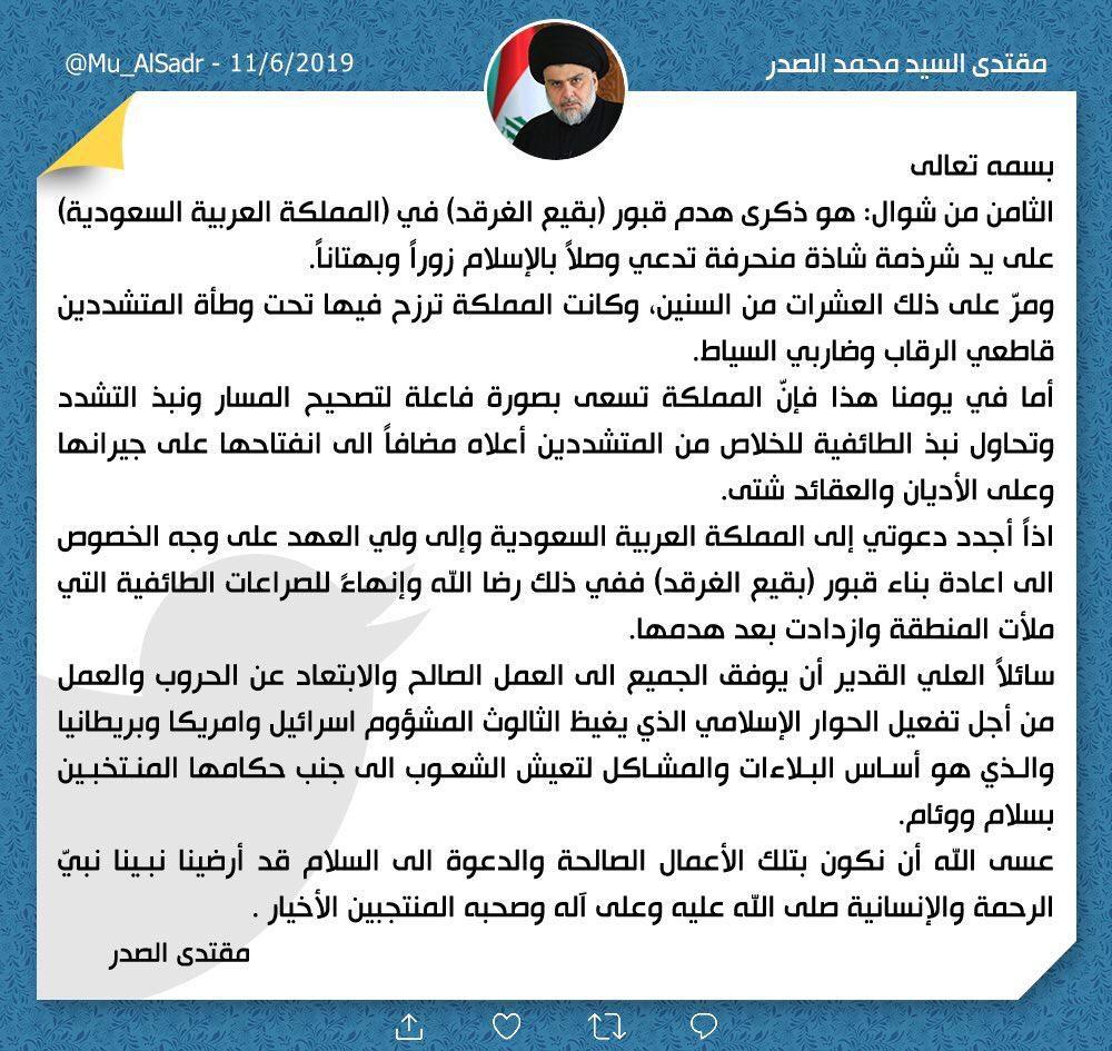 وقال الصدر في تغريدة على حسابه بموقع "تويتر" الثلاثاء، 11 حزيران 2019، إن "الثامن من شوال هو ذكرى هدم قبور بقيع الغرقد في السعودية على يد شرذمة شاذة منحرفة تدعي وصلا بالإسلام زورا وبهتانا".