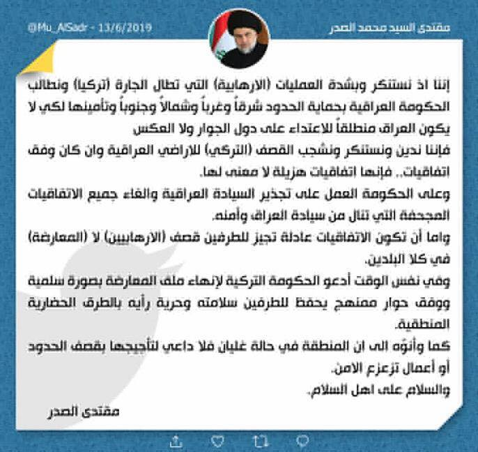 وقال الصدر في تغريدة له ، "نستنكر وبشدة العمليات الارهابية التي تطال تركيا"، مطالبا الحكومة العراقية بحماية الحدود وتأمينها لكي لا يكون العراق منطلقا للاعتداء على دول الجوار".