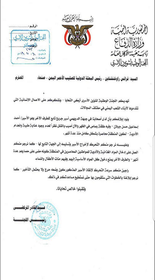 وذكرت اللجنة انها رفعت بتاريخ 8/5/2019 مذكرة الى البعثة الدولية للصليب الأحمر الدولي في اليمن، تبلغهم عن حالة الأسير الذي يتبع الطرف الآخر لدى قوات صنعاء داخل مدينة الدريهمي.