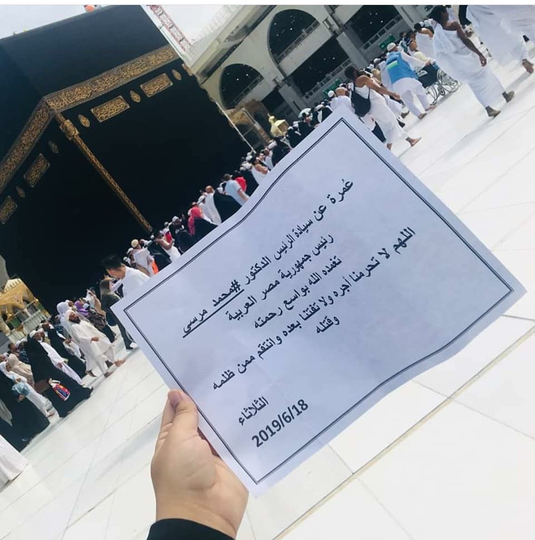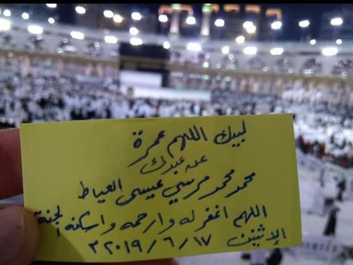 تداول نشطاء صورا تظهر أشخاص في ساحة الحرم الشريف، وهم يحملون أوراقا توضح أداءهم العمرة عن مرسي، وتتضمن دعوات له بالرحمة والمغفرة.
