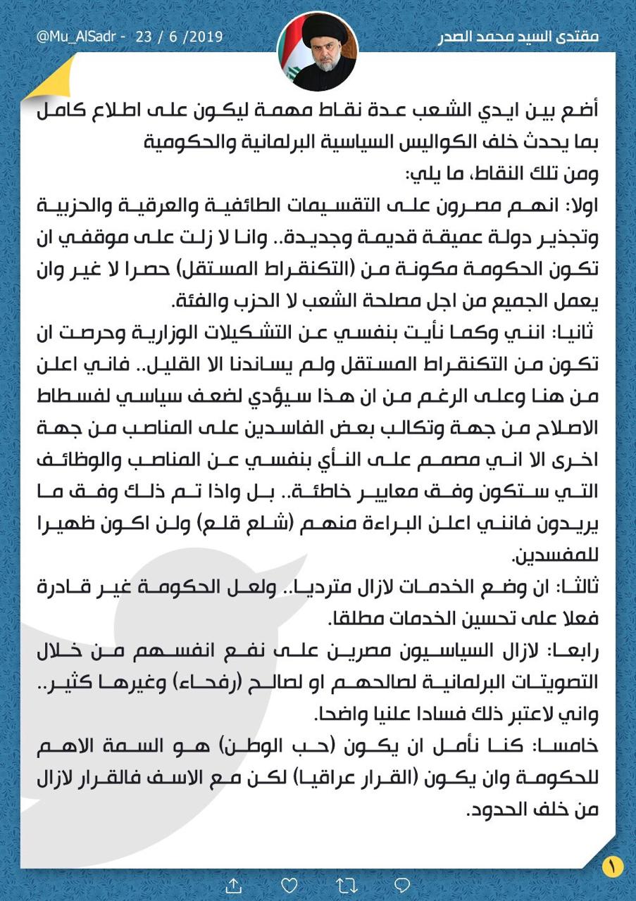 وقال الصدر في تغريدة له نشرت على حسابه الرسمي في تويتر، "اضع بين ايدي الشعب عدة نقاط مهمة ليكون على اطلاع كامل بما يحدث خلف الكواليس السياسية البرلمانية والحكومية"، مبينا انهم "مصرين على التقسيمات الطائفية والعرقية والحزبية وتجذير دولة عميقة قديمة وجديدة".