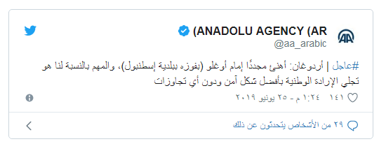 وكتب الرئيس التركي، رجب طيب أردوغان، على تويتر يقول: "أهنئ أكرم إمام أوغلو، الذي فاز في الانتخابات، بناء على النتائج الأولية".
