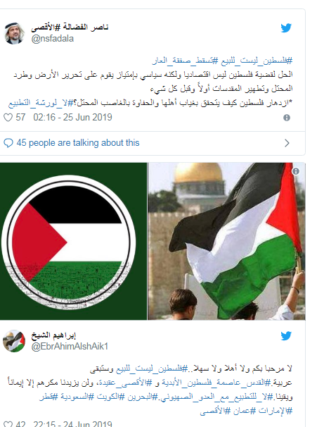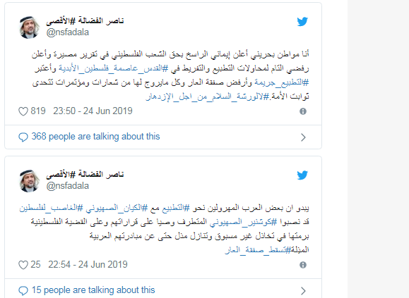 النائب السابق في البرلمان، ناصر الفضالة، غرد تحت هاشتاغ "لا لورشة التطبيع"، قائلا: "الحل لقضية فلسطين ليس اقتصاديا، لكنه سياسي بامتياز، يقوم على تحرير الأرض، وطرد المحتل، وتطهير المقدسات أولا وقبل كل شيء".