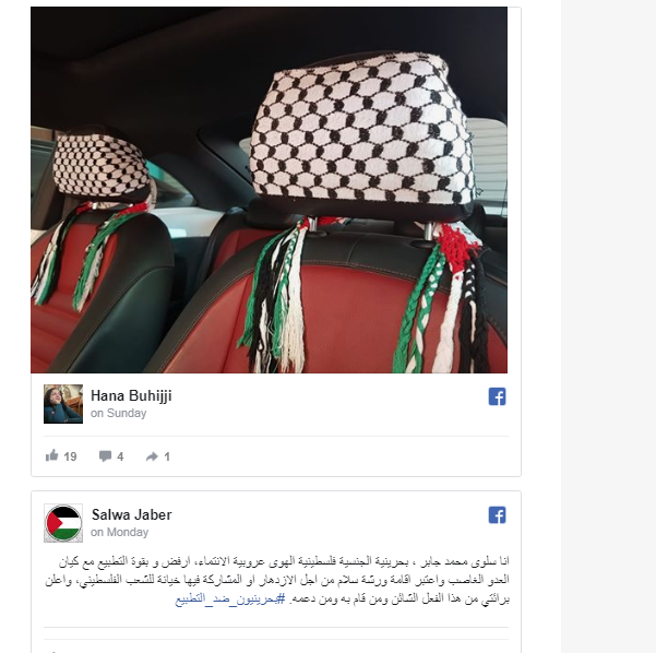 الصحفية هناء بوحجي، اختارت طريقة أخرى للتعبير عن رفضها لمؤتمر البحرين، بوضع "الكوفية الفلسطينية" على مقاعد سيارتها.