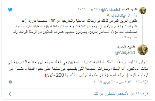 وأشار الحساب الشهير إلى أن الأخوياء يتلقون مخصصات تصل 75 ألف ريال، إضافة إلى امتيازات وأعطيات آخرى، في حين تتجاوز تكلفة سهرات الملك وجلسات البلوت (وحدها) شهريا 25 مليون ريال، وتصل مجمل مصاريف الملك شهريا، (في حال لا توجد رحلات داخلية أو خارجية)، 350-400 مليون ريال، (عدا الموظفين الأمنيين والعسكريين)!