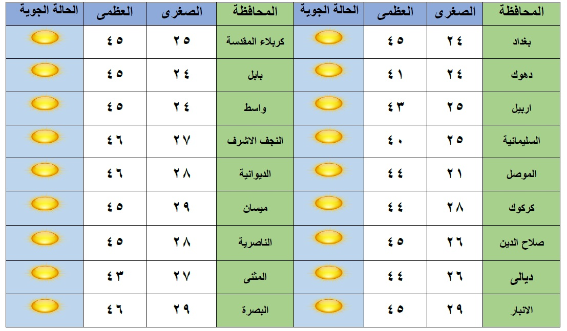 واشار الى ان بغداد ستسجل درجة حرارة عظمى تبلغ 45 درجة مئوية، فيما تسجل محافظات البصرة والديوانية والنجف اعلى ارتفاعا بدرجات الحرارة والتي تصل لـ46 درجة مئوية، في حين تكون السليمانية الاكثر انخفاضا في درجة الحرارة، حيث تسجل 40 درجة مئوية للحرارة العظمى.