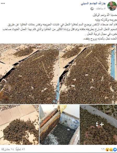 ونشر مدونون عبر صفحات تواصل اجتماعي، صورا وتفاصيل تفيد بـ “قيام أحد ضعفاء النفس بوضع السم لخلايا النحل في غابات الحويجه وتقدر بمئات الخلايا عن طريق تسميم النحل السارح بطريقة متقنة وتم قتل وإبادة الكثير من الخلايا”.