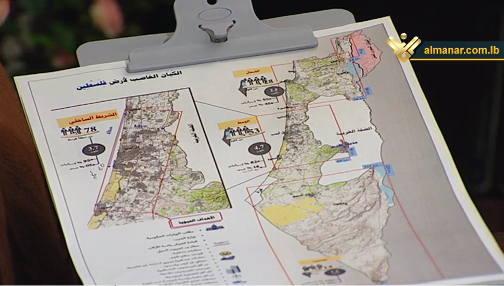 لبنان-الكوثر: الامين العام لحزب الله السيد حسن نصر الله عرض خلال مقابلته مع المنار خريطة توضيحية حول توزيع الاهداف والمراكز الحيوية في الكيان الصهيوني التي تستطيع ان تطالها المقاومة بصواريخها.