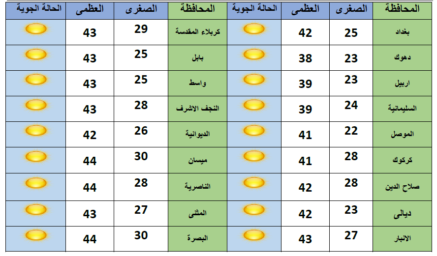 وذكر بيان للهيئة ان "طقس يوم غد الثلاثاء سيكون في المنطقتين الوسطى والشمالية مشمساً وفي المنطقة الجنوبية مشمساً حاراً فيما ترتفع فيها درجات الحرارة بضع درجات، وتكون العظمى في العاصمة بغداد 42 مْ وفي البصرة 44 مْ".