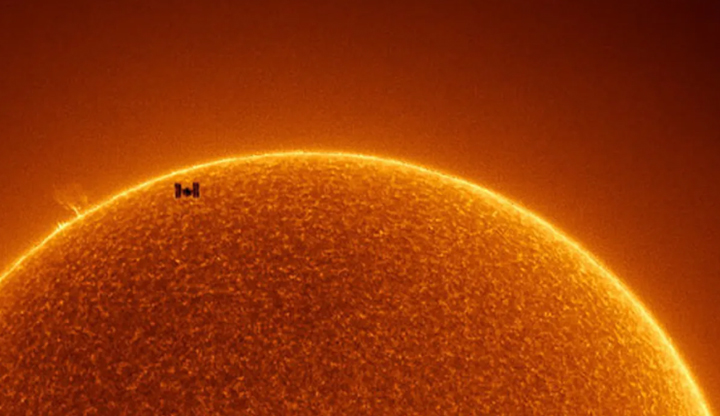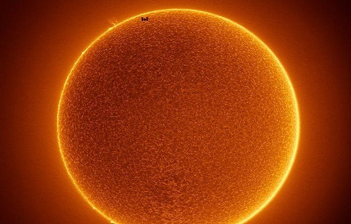 والتقط المشهد الرائع لمرور المحطة الفضائية الدولية أمام الشمس، من قبل المصور رايني كولاكورسيو، وأوضحت وكالة الفضاء الأمريكية: "هذه ليست بقعة شمسية، إنها محطة الفضاء الدولية(ISS) التي تم رصدها وهي تمر أمام الشمس"، فالبقع الشمسية لديها ظلمة مركزية داكنة، وأخف وزنا في محيطها، ولا توجد بها ألواح شمسية كالتي ظهرت في الصورة.