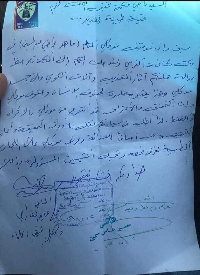 وتابع "اطلب من سيادتكم نقل الاوراق التحقيقية، واعادة التحقيق، وذلك احقاقا للعدالة وعرض موكلي على اللجان الطبية لغرض فحصه وتحميل المتسببين المسؤولية بذلك".