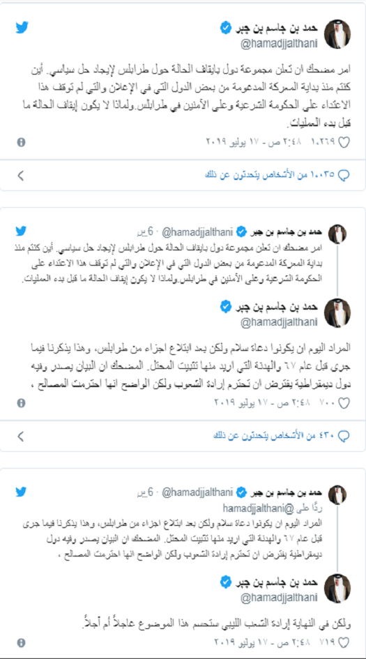 وكتب بن جاسم في تغريدة على صفحته الرسمية في موقع التواصل الاجتماعي "تويتر" اليوم الأربعاء: " أمر مضحك أن تعلن مجموعة دول بإيقاف الحالة حول طرابلس لإيجاد حل سياسي".