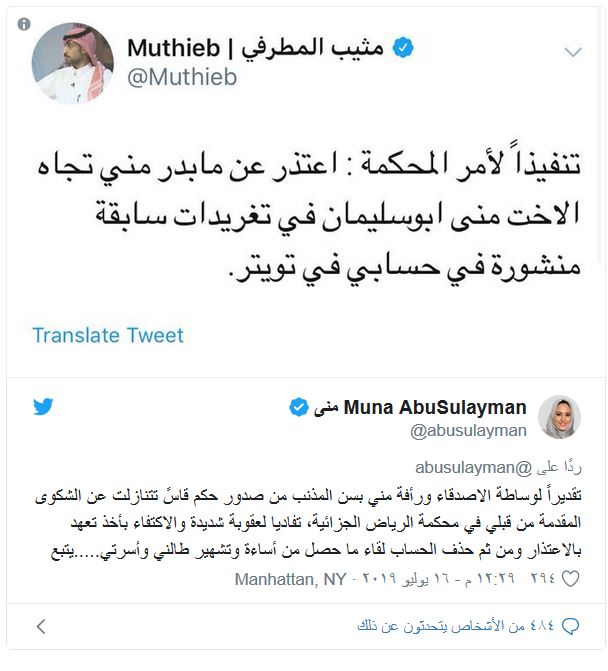 بحسب صحيفة عكاظ السعودية، أمرت المحكمة بإغلاق حساب الإعلامي السعودي مثيب المطرفي، بعد استخدامه تهكمه وتهجمه في تغريدات على حسابه الموثق بـ"تويتر" على الإعلامية السعودية، منى أبو سليمان، وألزمت المحكمة المطرفي أن ينشر اعتذارا للإعلامية قبل إغلاق حسابه.