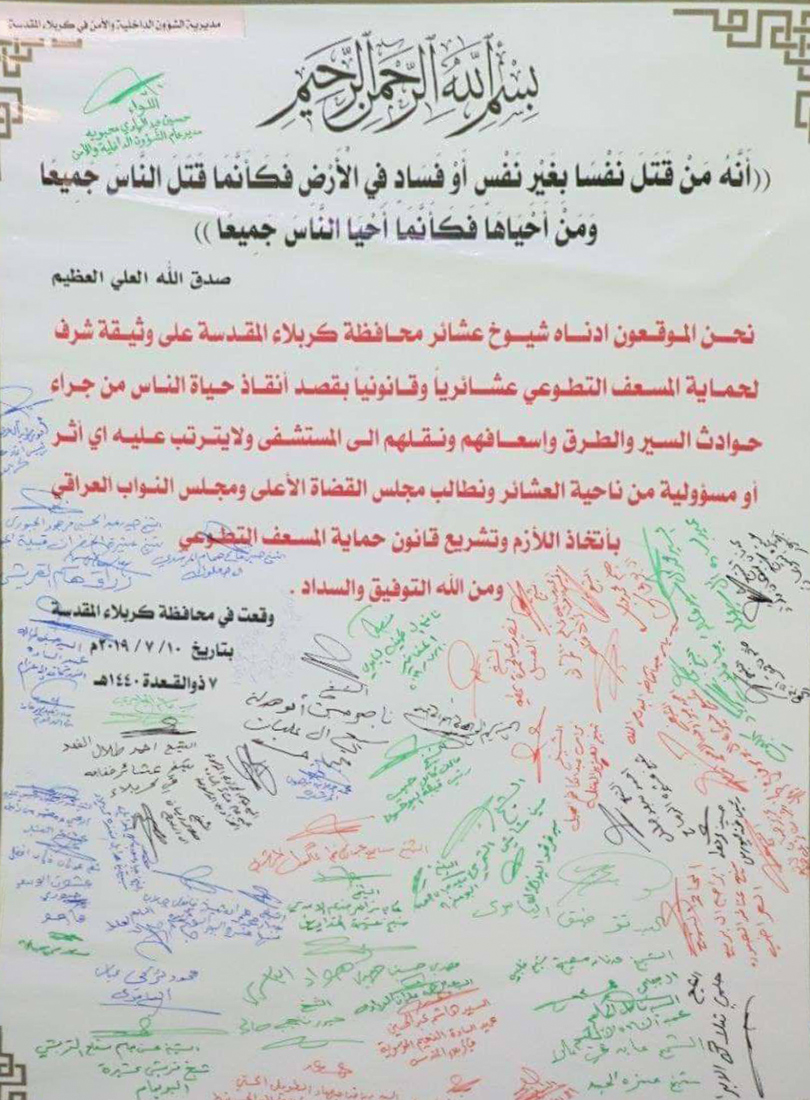 وبين انه "في الاسبوع المنصرم تم اقامة مؤتمر لشيوخ عشائر الفرات الاوسط وشيوخ كربلاء لحماية المسعف في حوادث الطريق, حيث تم اصدار تعهد من شيوخ العشائر لحماية المسعف وعدم تعرضه للمسائلة القانونية او العشائرية".