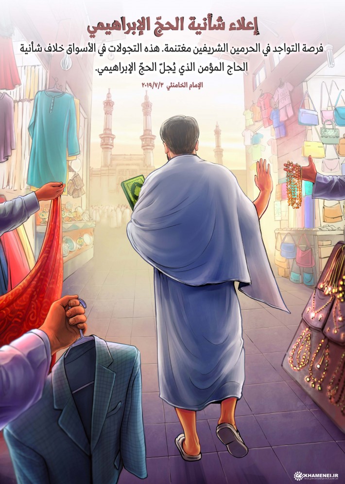 اهتموا كثيراً بالدعاء والصلاة والخشوع والتوسل. الحق أن فرصة التواجد في المسجد الحرام ومسجد النبي فرصة مغتنمة لا تتاح للإنسان العادي بسهولة. وقد أتيحت لكم الآن ولأولئك الحجاج الإيرانيين المحترمين واستطاعوا وتوفقوا للوصول إلى هناك. الدعاء والصلاة في المسجدين والطواف في المسجد الحرام والتضرع والتوجه إلى الله، هذه أمور يجب عدم التفريط بها. أن يتجولوا في الأسواق وهنا وهناك للتبضع والشراء وما إلى ذلك فهذا بخلاف شأن المؤمن العارف لقدر الحج الإبراهيمي. ~الإمام الخامنئي ٢٠١٩/٧/٣
