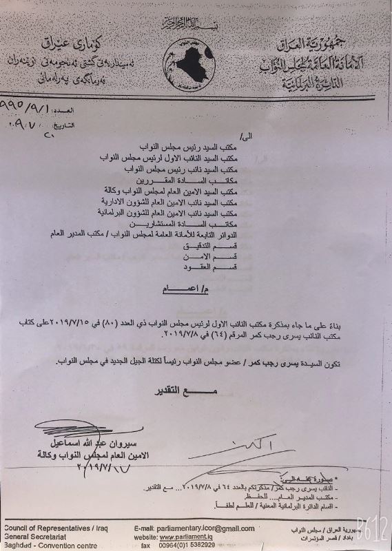 واظهرت وثيقة رسمية صادرة من الامانة لمجلس النواب - الدائرة البرلمانية تعميما بتكليف النائبة يسرى رجب كمر بمهام رئاسة كتلة الجيل الجديد.