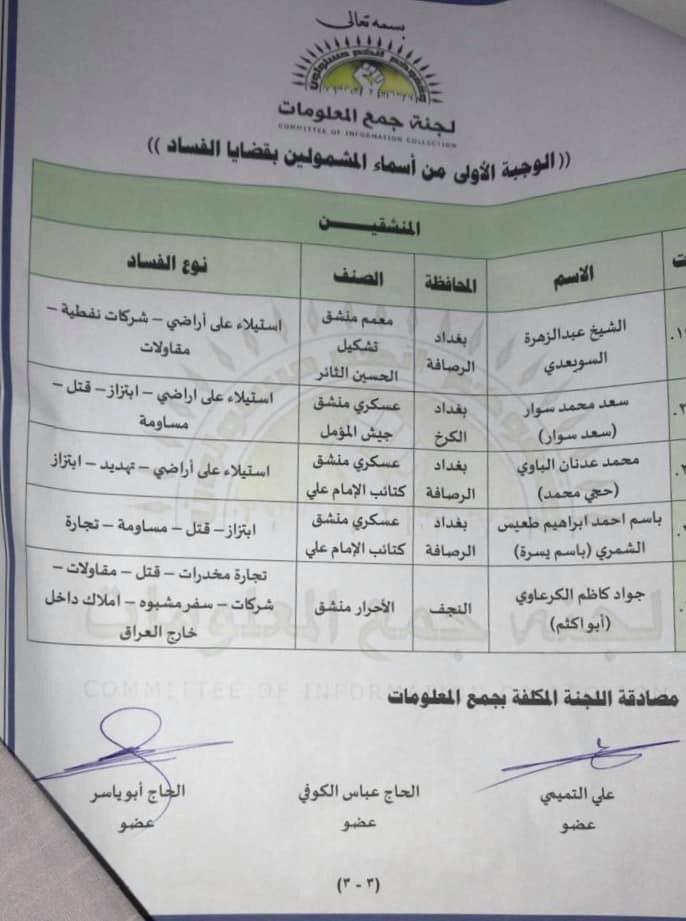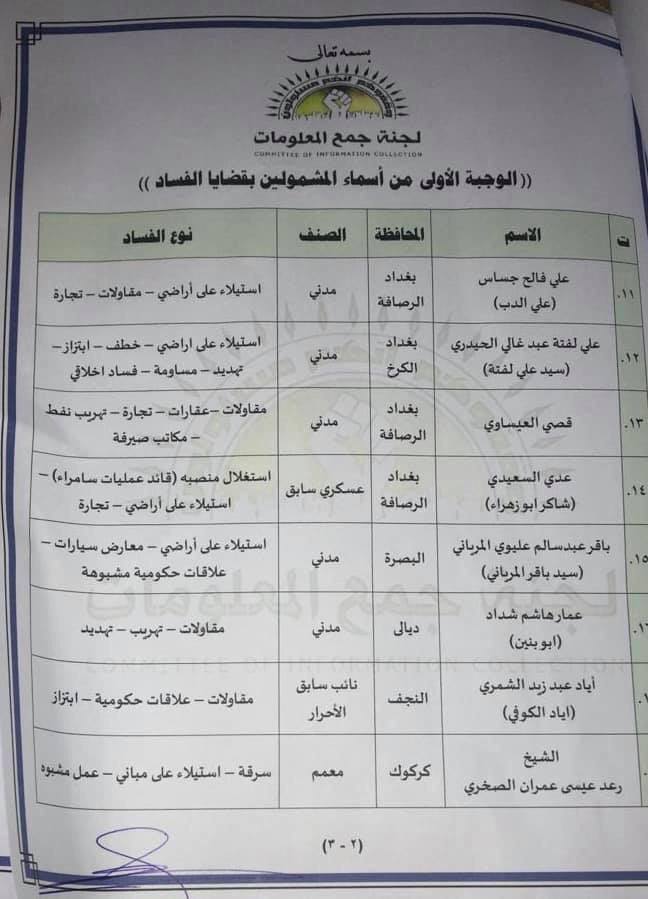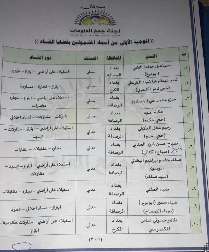 اعلنت لجنة جمع المعلومات في مكتب زعيم التيار الصدري، مقتدى الصدر، أمس الاثنين، عن اسماء الوجبة الاولى من المشمولين بقضايا فساد.