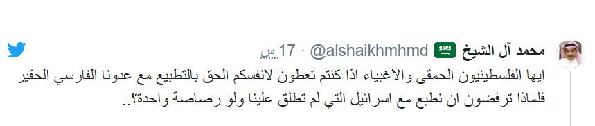 ودون ما نصه:”ايها الفلسطينيون الحمقى والاغبياء اذا كنتم تعطون لانفسكم الحق بالتطبيع مع عدونا الفارسي الحقير فلماذا ترفضون ان نطبع مع اسرائيل التي لم تطلق علينا ولو رصاصة واحدة؟”