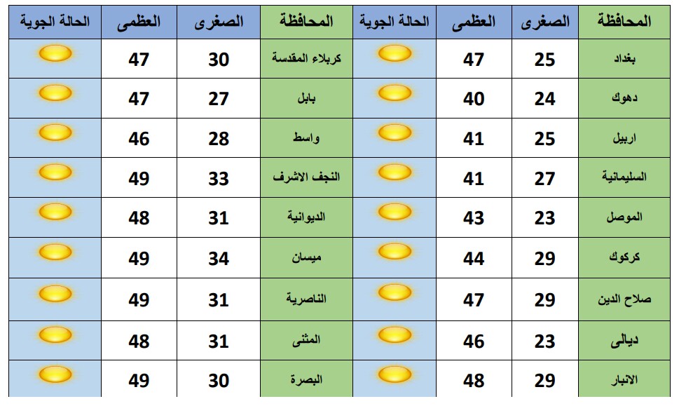 واشار الى ان بغداد ستسجل درجة حرارة عظمى تبلغ 47 درجة مئوية، فيما تسجل محافظات البصرة وميسان والناصرية والنجف اعلى ارتفاعا بدرجات الحرارة والتي تصل لـ49 درجة مئوية للحرارة العظمى، في حين تكون دهوك الاكثر انخفاضا في درجة الحرارة، حيث تسجل 40 درجة مئوية للحرارة العظمى.