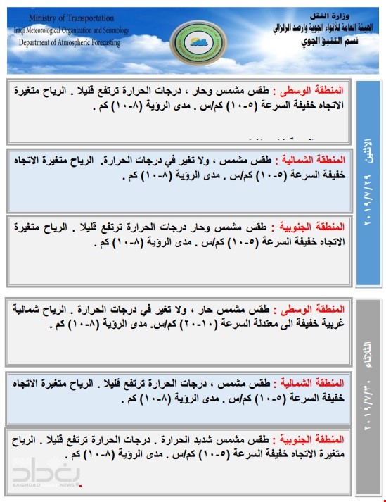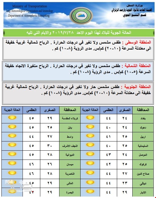 وقالت الهيأة في جداول توضيحية ان درجات الحرارة العظمى ستستقر اليوم الاحد وتكون ضمن المعدلات العامة حيث ستبلغ في بغداد والانبار وصلاح الدين وديالى وواسط 44 مئوية وفي البصرة 47 ، وفي الديوانية والمثنى والنجف 45 مئوية ، و 46 في الناصرية وميسان ، فيما اوضحت توقعاتها لبقية المحافظات في الجداول ذاتها.