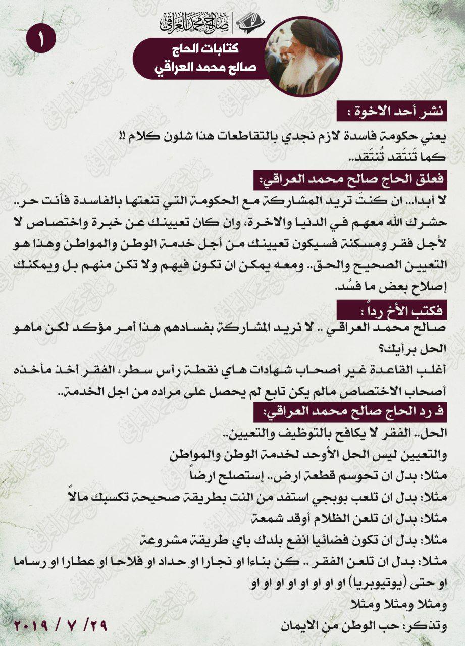 قدم صالح محمد العراقي المقرب من زعيم التيار الصدري السيد مقتدى الصدر حلولاً على رسالة أحد الاشخاص لمن يبحثون عن التعيين.