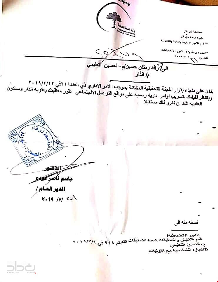 وجه مدير عام دائرة صحة ذي قار في العراق جاسم ناصر عودة بعدم تسليم مدير مستشفى الحسين التعليمي رافد رمثان أي منصب إداري في المستقبل بسبب "تسريبه أوامر إدارية رسمية" على مواقع التواصل الاجتماعي.